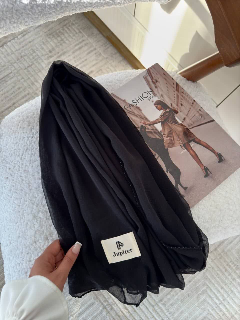 شال حریر شیفون ملیله دوزی تک رنگ و کاملا مشکی🖤 جنسش عالیه وسبک و لطیف ایستایی و سرخورش عالیه سرنیست قواره ۷۵×۲ #قیمت شال مشکی #شال حریر #شال مجلسی #شال تخفیف خورده